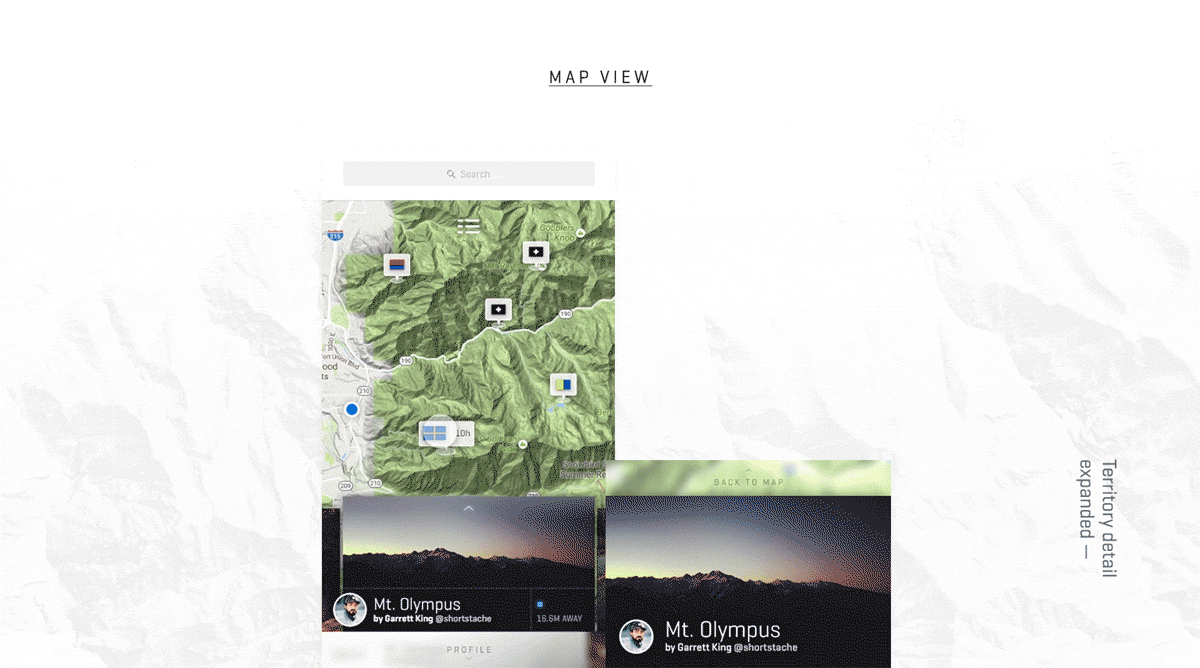 This is a conceptual brand-focused digital product meant to engage new and existing customers of Lander, an outdoor tech-accessories brand. The idea is to encourage users to claim territories, which are outdoor experiences (hikes, destinations, etc.) curated by Lander brand ambassadors, by offering rewards and discounts for territories claimed in a king-of-the-hill style.